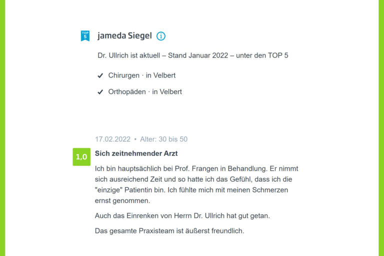 Vielen Dank für Ihre tollen Bewertungen! Sie haben uns unter die Top 5 auf der Ärztebewertungsseite „Jameda“ gewählt.